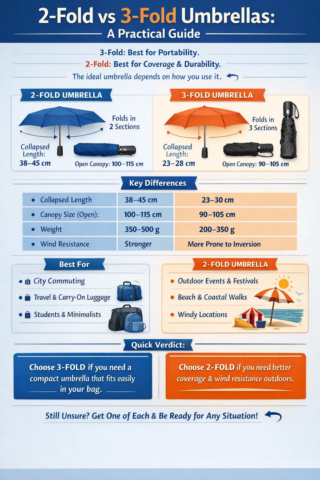 To znamená, že pokud se ptáte, který kompaktní skládací deštník je vhodnější pro denní použití na pláži – možná jdete na pláž, potřebujete stín při čekání na své místo nebo chcete ochranu před sluncem, když sedíte venku u plážové kavárny – 2-skládací je praktičtější volbou. Jeho větší baldachýn poskytuje smysluplnější stín, když je slunce vysoko, a jeho robustnější rám si lépe poradí s poryvy typickými pro otevřené pobřežní lokality.