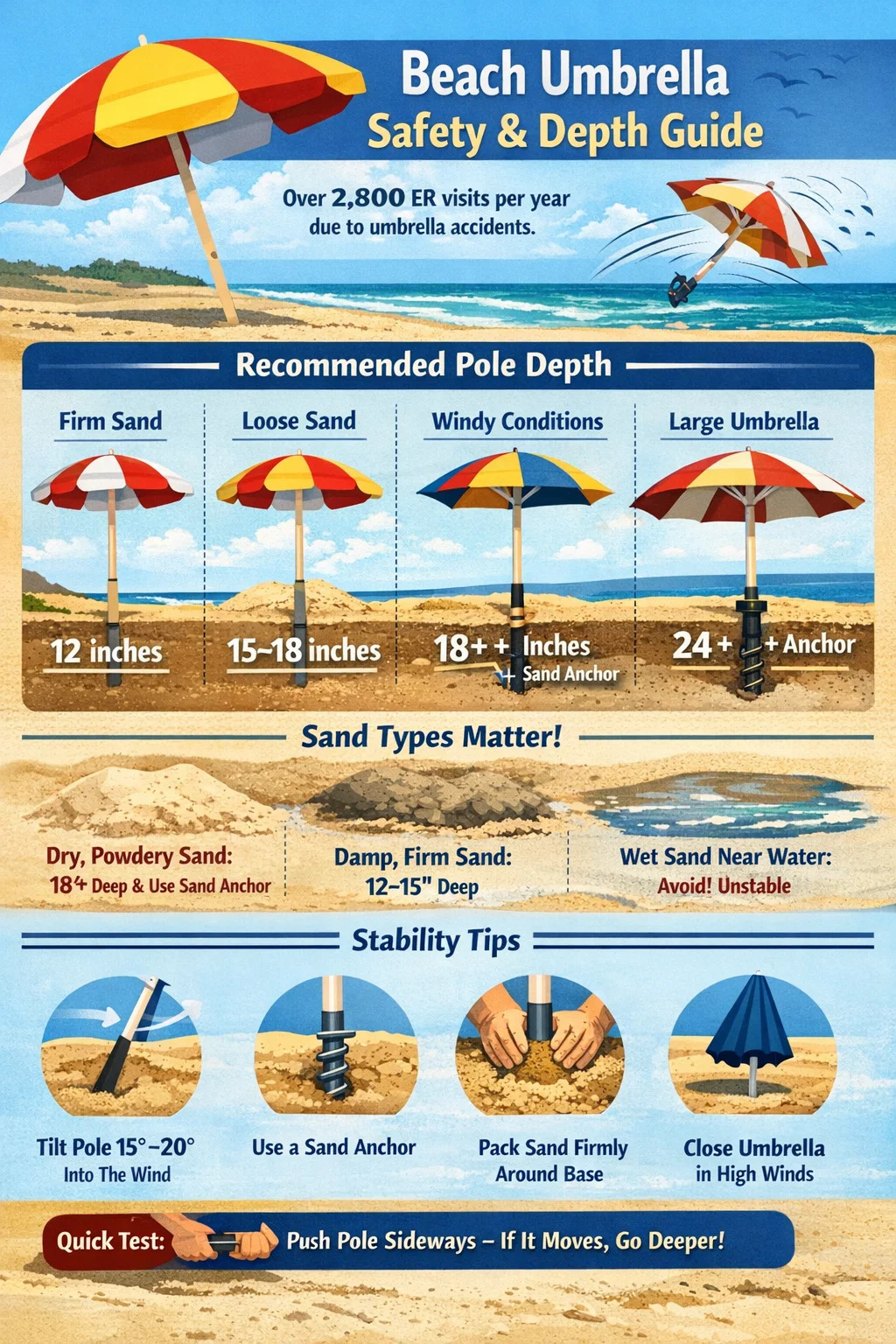 Všeobecně doporučené minimum 12 palců platí za průměrných podmínek na pláži: středně kompaktní písek, lehký až jemný vánek (do 10 mil/h) a standardní slunečník na pláži 6–7,5 stop. V podmínkách reálného světa budete často muset jít hlouběji.