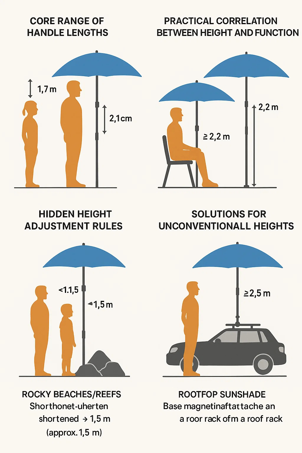 Krátké deštníky (≤1,8 metrů): Při sezení navrženo pro ochranu před sluncem. Výška okraje odpovídá opěradla plážového křesla (70-80 cm) a zajišťuje, že hlava je při stolování vystavena slunci.