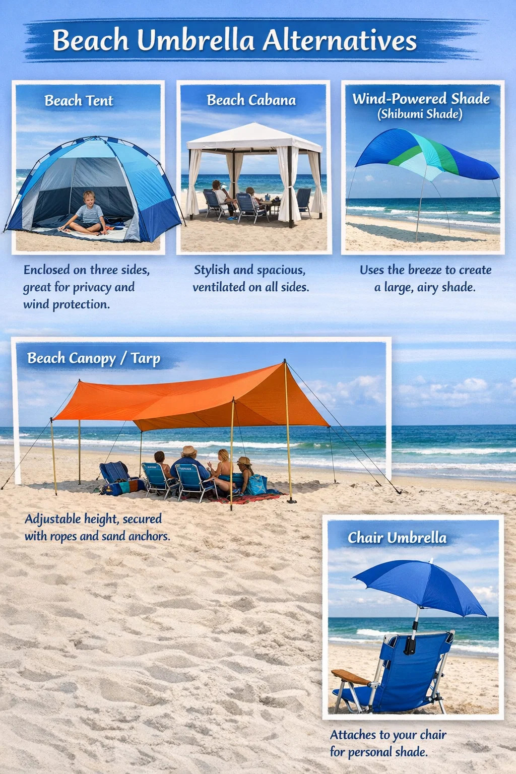 Způsob zajištění: Většina plážových stanů je dodávána s kapsami na pytle s pískem, které jsou po naplnění pískem velmi stabilní a méně pravděpodobné, že se převrhnou než plážové deštníky.