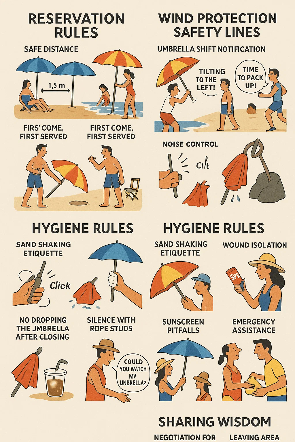 Bezpečná vzdálenost: Udržujte vzdálenost šířky dvou plážových lehátek (přibližně 1,5 metru) od slunečníku vašeho souseda. Pokud se stín vašeho deštníku odchyluje od oblasti jiné osoby, omluvte se a podle toho se přizpůsobte.