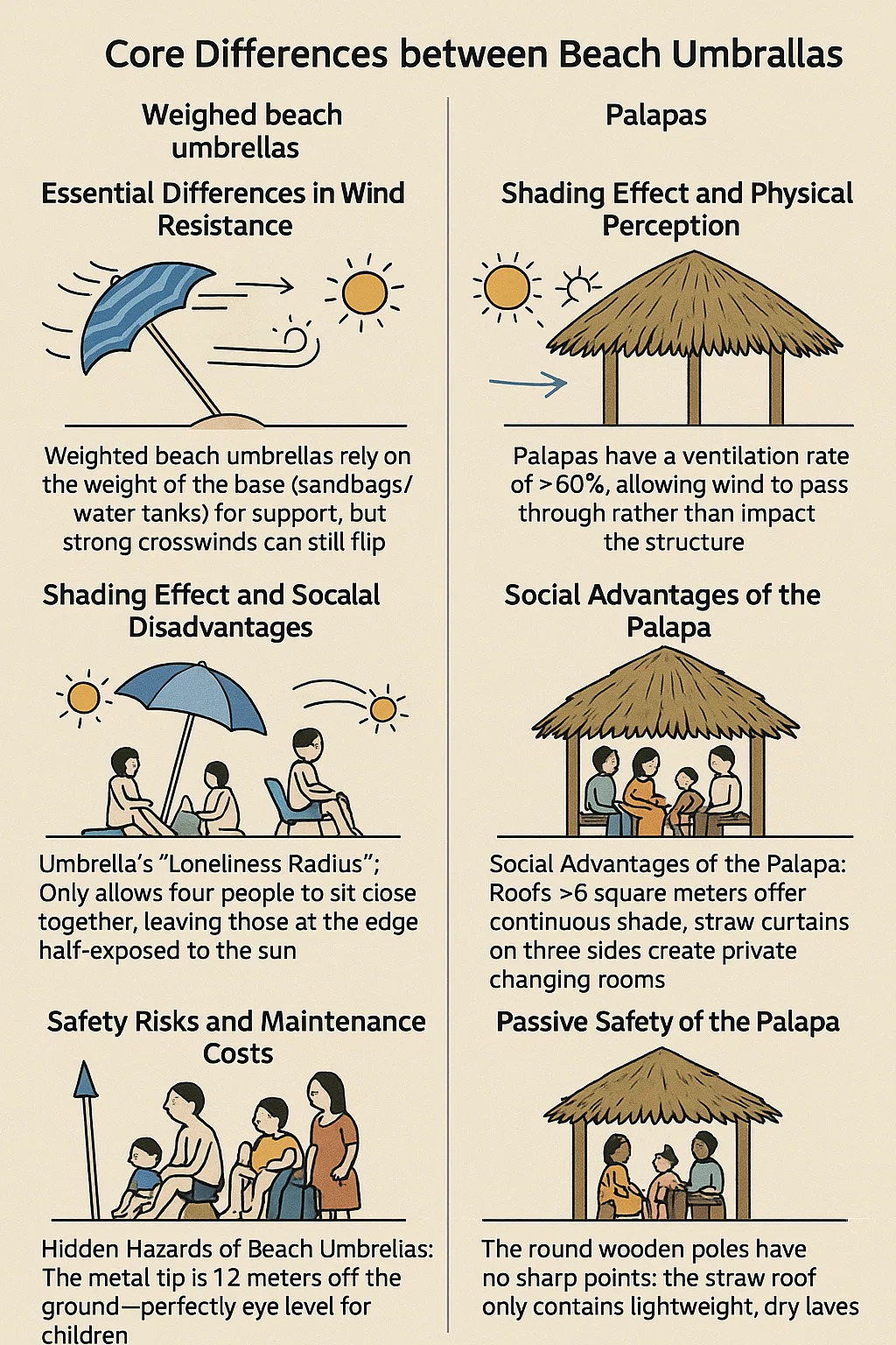 Omezení ochrany proti slunci na pláži: Stín pod deštníkem se posune s úhlem slunce a vyžaduje časté úpravy. Stříbrný povlak odráží tepelné záření ze země neefektivně, takže i v poledne, kdy je povrch písku 60 ° C, může teplota pod deštníkem stále překročit 40 ° C. Palapas nabízí přirozené chlazení: zahuštěné palmové listy absorbují spíše než odrážejí, udržují konstantní úroveň vlhkosti (měřené na pláži, o 3-5 ° C nižší než pod deštníkem); Plné sluneční stíny nevyžaduje žádné úpravy.